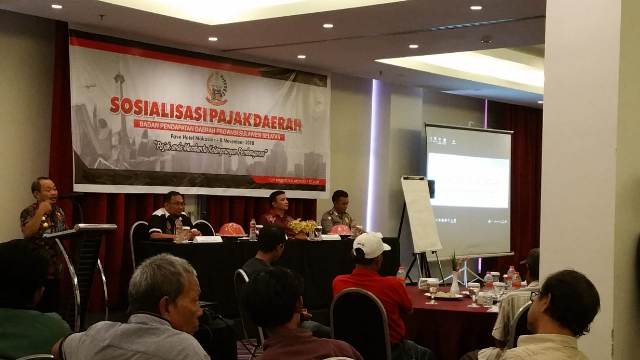 Makassar– Kepala Badan Pendapatan Daerah Provinsi Sulsel Tautoto TR membuka dan membawakan materi pada sosialisasi pajak daerah Kamis (1/11) di Hotel Fave Makassar. Sosialisasi ini dihadiri Wakil Ketua DPRD Sulsel Rudi P. Goni.