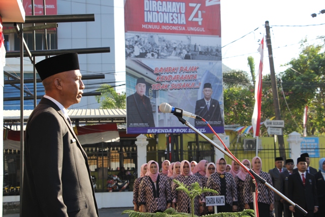 Makassar – Upacara Memperingati Hari Ulang Tahun Kemerdekaan Republik Indonesia ke-74 di Badan Pendapatan Daerah (Bapenda) Provinsi Sulawesi Selatan (Sulsel) berlangsung hikmat. Upacara dipimpin Kepala Bapenda Sulsel Andi Sumardi Sulaiman sebagai inspektur upacara.