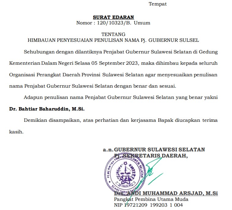 MAKASSAR – Penjabat Sekretaris Daerah Provinsi Sulsel Drs. Andi Muhammad Arsjad, M.Si mengeluarkan surata edaran Nomor : 120/10323/B. Umum tentang himbauan penyesuaian penulisan nama Penjabat Gubernur Sulsel.