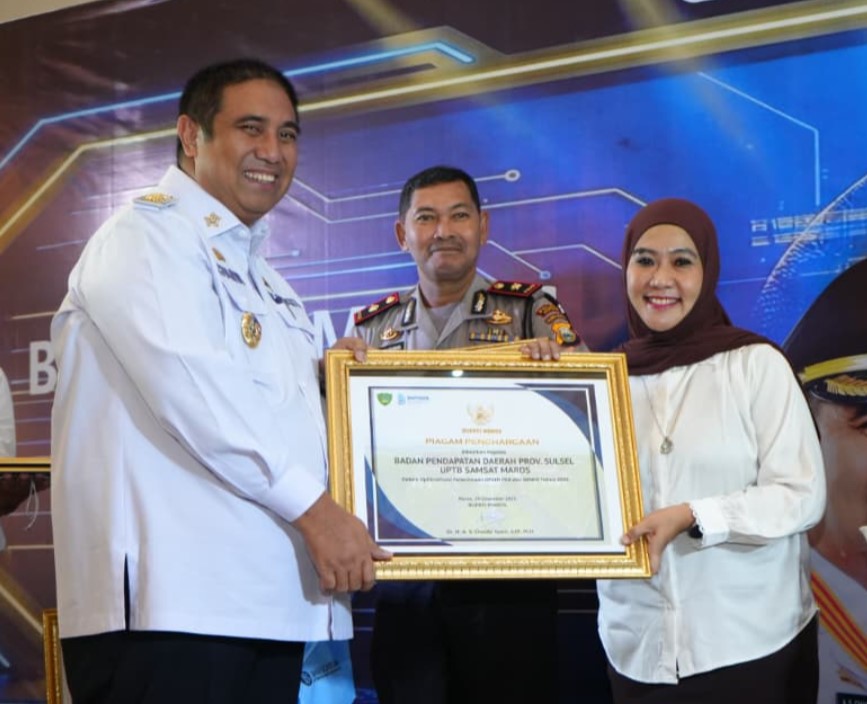 Maros – Bupati Maros melalui Badan Pendapatan Daerah (Bapenda) Maros memberikan penghargaan kepada Unit Pelaksana Teknis (UPT) Bapenda Sulsel Wilayah Maros atau Samsat Maros atas kontribusinya dalam mendukung peningkatan Pendapatan Asli Daerah (PAD) Kabupaten Maros.