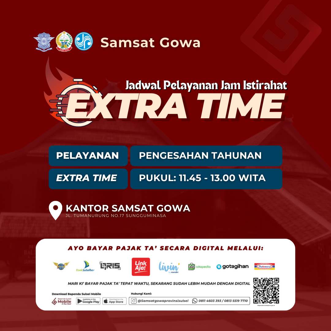 Manfaatkan pelayanan PENGESAHAN TAHUNAN yang tetap buka selama jam istirahat ygy mariki’ ke Kantor Samsat Gowa.